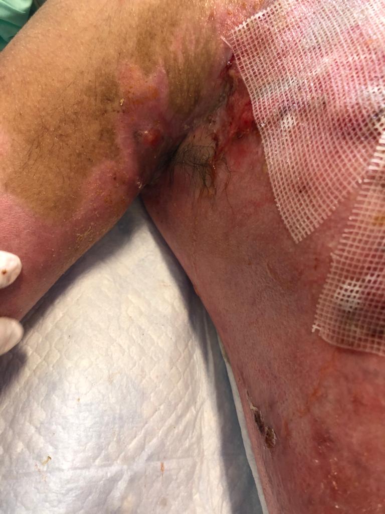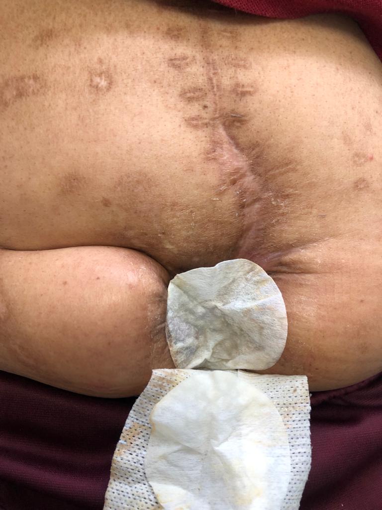 Secuencia de imágenes de un abdomen abierto por traumatismo, con un año de evolución, el abdomen ya no presenta cavitaciones y va cicatrizando favorablemente en un lapso de 4 meses con ayuda de nuestro producto SILVRSTAT.